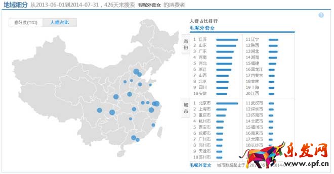 我們繼續,從下圖可以知道喜歡搜毛呢外套女這個關鍵詞都分布在哪些地方還有人群占比各是多少,這個數據適合大家拿去做直通車地域投放,喜好度低的地區就可以不投放,從而提高直通車點擊率。