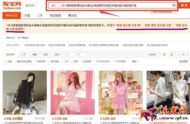 因為你搜的是全關(guān)鍵詞,搜索的結(jié)果很少,所以,淘寶就給你指定了關(guān)鍵詞,這里指定的就是“春裝 連衣裙 女裝 裙”、“春裝 雪紡 連衣裙 女裝”、“春裝 連衣裙 女裝 歐根紗”。