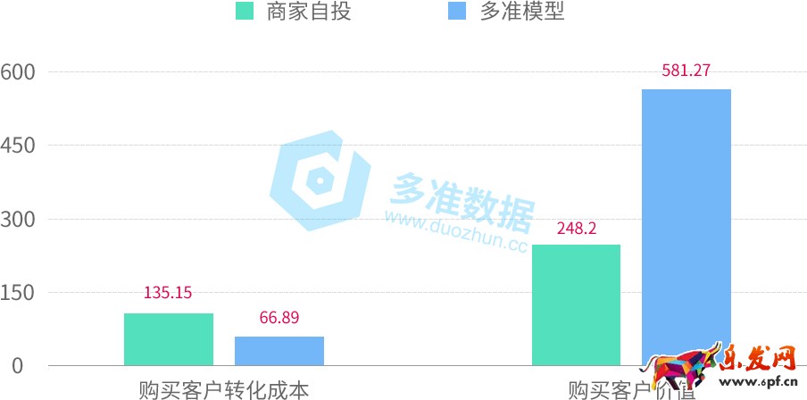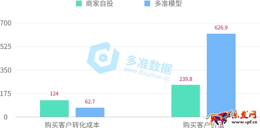 相比商家自投,點擊單價差不多,我們投放的點擊率提高了29%,ROI提高了237%;同時客戶轉化成本降低了49%,單個客戶價值卻高出了161%。