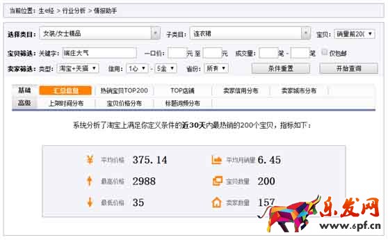 在這里找到類目,然后輸入你要篩選的關(guān)鍵詞,甚至你都可以在價(jià)格上去做設(shè)定,干什么用呢?主要是分析一下你的競(jìng)爭(zhēng)對(duì)手,看看最熱銷的寶貝是什么樣的,大概銷量情況,基本的價(jià)格分布、上架時(shí)間分布、賣(mài)家城市分布等等,這些對(duì)于你判斷是否進(jìn)入一個(gè)市場(chǎng),都是很好的依據(jù)。