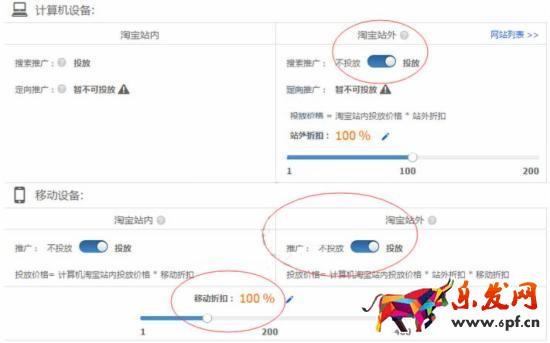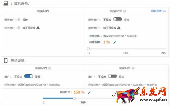 針對上面的情況,我們第一步先把PC和無線的站外平臺關(guān)閉,如果定向推廣能開啟的店鋪也建議先關(guān)閉,一般來說,這三個投放平臺總體上相比站內(nèi)的點擊率會比較低,如果開啟會整體拉低整個計劃的點擊率。由于現(xiàn)在的無線端點擊率要比PC端的要總體高出不少,所以無線折扣方面暫時拉升到150%,如下圖。