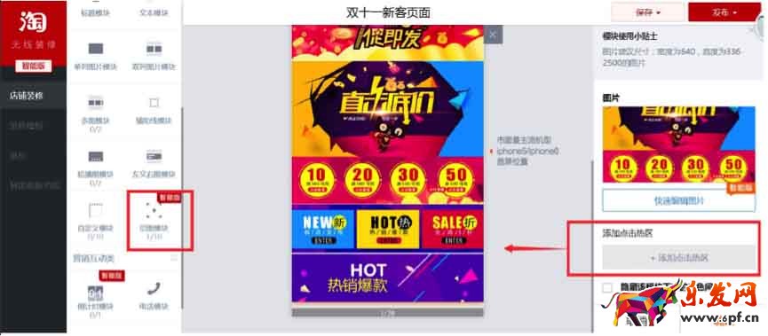 在詳情頁布局時建議大家點擊右上角的模板管理按鈕,建議設計好自己的模板,不要用官方模板。這里還有一個十分方便的熱點鏈接功能,我們可以在海報里框出任何區域鏈接到我們想要鏈接的頁面。