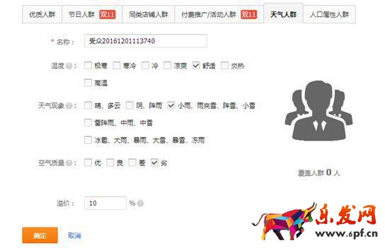 (3)天氣人群(全部打開):同樣逐個(gè)添加項(xiàng)目;同樣采用上坡法、下坡法。溢價(jià)10%-50%