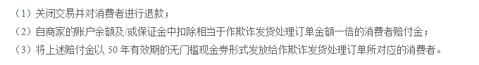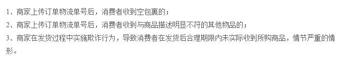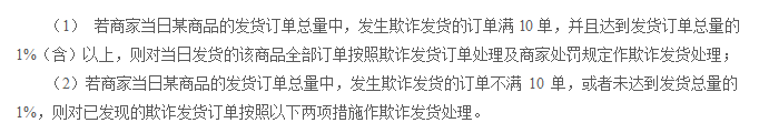 本條款所稱“欺詐發貨”均指商家當日某商品的發貨訂單總量中,發生欺詐發貨的訂單滿10單,并且達到發貨訂單總量的1%(含)以上的情形。