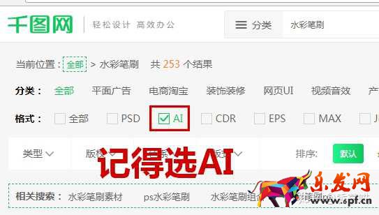 我們用一小段水彩代替?zhèn)鹘y(tǒng)的文字框,讓裝修顯得逼格更高(咳咳),這個其實更簡單了,登錄千圖網(wǎng)_專注免費設計素材下載的網(wǎng)站_免費設計圖片素材中國,輸入“水彩筆刷”,格式選“AI”,可以用的素材多到你想不到