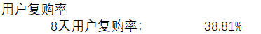 8天,用戶復(fù)購率只有38%,也就是說100個客戶只有38個購買兩次以上,復(fù)購率較低