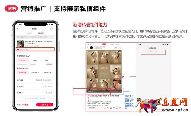 升級后的「薯條」新增了私信組件能力,可以在筆記上展示快捷私信入口,用戶點擊筆記詳情頁的【立即咨詢】即可跳轉至私信窗口,大幅縮短了用戶與企業商家的溝通鏈路,幫助企業商家提升線索留資的效率。