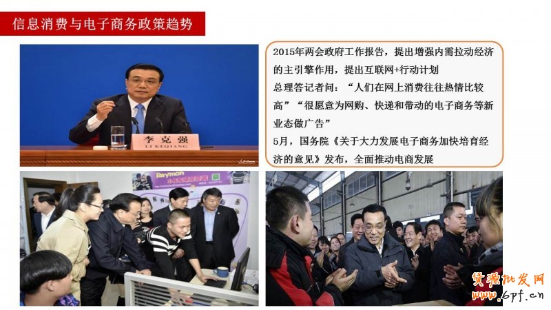 這樣一個(gè)主引擎的作用,國(guó)家領(lǐng)導(dǎo)人也非常關(guān)注。從李克強(qiáng)總理去年一系列的動(dòng)作來(lái)看,國(guó)家也對(duì)中國(guó)新的增長(zhǎng)點(diǎn)高度重視。去年11月份,李克強(qiáng)總理到訪了網(wǎng)店第一村。15年兩會(huì)結(jié)束答記者問(wèn)的時(shí)候,總理提出說(shuō)人們?cè)诰W(wǎng)上的消費(fèi)熱情往往比較高,并且表示他很愿意為網(wǎng)購(gòu),還有快遞帶動(dòng)的電子商務(wù)新業(yè)態(tài)來(lái)做廣告,這都是非常直白的話語(yǔ)。同時(shí),今年的政府工作報(bào)告也提出了內(nèi)需拉動(dòng)經(jīng)濟(jì)的模式。政策方面,今年5月國(guó)家出臺(tái)了《關(guān)于大力發(fā)展電子商務(wù)加快培育經(jīng)濟(jì)新動(dòng)力的意見(jiàn)》,我們稱為“電子商務(wù)國(guó)八條”,這是全面推進(jìn)電子商務(wù)的政策信號(hào)。