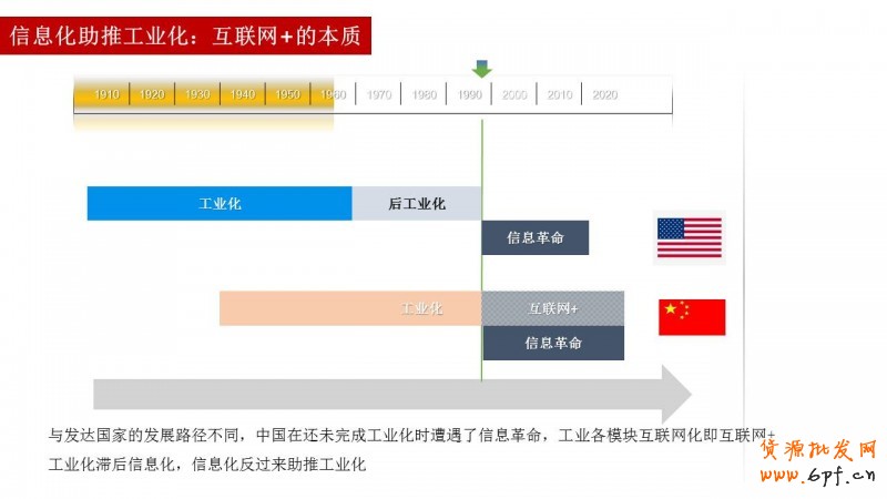 總理今年也提出了“互聯(lián)網(wǎng)+”的概念,什么叫“互聯(lián)網(wǎng)+”,我的理解是這樣:中國(guó)的發(fā)展軌跡跟其它的發(fā)達(dá)國(guó)家不太一樣。以美國(guó)為例,美國(guó)是先完成了工業(yè)化,然后才進(jìn)入信息革命。而中國(guó)不是這樣,中國(guó)的工業(yè)化要到2025年的時(shí)候才完成,我們?cè)谶€沒(méi)有完成工業(yè)化的時(shí)候,興起了信息革命。這樣工業(yè)化跟信息時(shí)代迭代,產(chǎn)生了“互聯(lián)網(wǎng)+”,用信息化反推工業(yè)化。所謂“互聯(lián)網(wǎng)+”就是工業(yè)化的各個(gè)模塊不按照原有的路徑來(lái)走,因?yàn)榛ヂ?lián)網(wǎng)跟信息革命產(chǎn)生迭代的關(guān)系,我們稱之為互聯(lián)網(wǎng)+,這可能是中國(guó)獨(dú)有的一個(gè)現(xiàn)象。